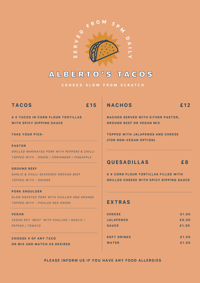 Alberto’s Tacos are a firm favourite on site! Alberto can be found serving up freshly made tacos from the Glen Sligachan food truck, from 5pm-8.30pm every day throughout the season. Take a look at the menu below.