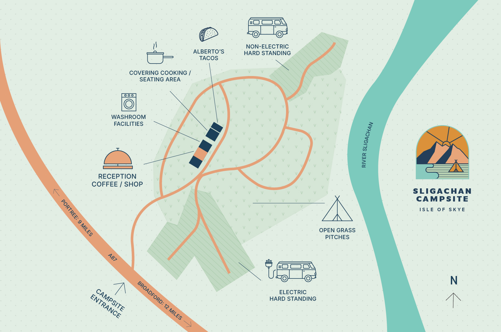 Surrounded by Skye’s iconic peaks, the Sligachan Campsite offers scenic pitches, hot showers, WiFi, great coffee, and tasty food - sleep wild and rise refreshed!